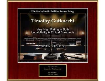 With this recognition, Attorney Timothy Gutknecht is celebrating his high professional achievement and unwavering commitment to ethical standards in the legal field. The Martindale-Hubbell(R) Peer Review Ratings(TM) are an objective indicator of a lawyer's high ethical standards and professional ability, based on evaluations by other members of the bar and the judiciary in the United States and Canada. The 'Distinguished' rating is widely regarded as an excellent mark for an attorney with significant experience, indicating that their peers rank them at a high level of professional excellence.